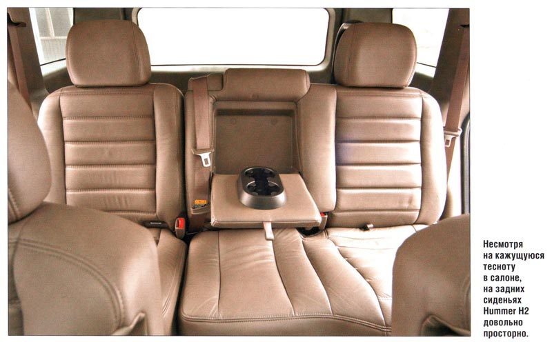 Пленившись внешним видом и габаритами Н2, все же не спешите его покупать. Для начала заберитесь внутрь, и, быть может, ваше мнение об автомобиле изменится. Он не такой уж и просторный, как может показаться со стороны. А салон так и вовсе может ввергнуть в грусть: покупатели дорогих внедорожников, которые даже в подержанном состоянии стоят $50 000 и более, привыкли к другим интерьерам. Тут же — простенький дешевый пластик, часто не идеально установленные детали, есть определенные нарекания к эргономике. Да и обзорность оставляет желать лучшего: из-за широченных стоек и узеньких боковых стекол водитель почти не видит происходящего сзади. Особенно тяжко приходится при езде в центре города — если поставить небольшую машинку типа «Оки» или Daewoo Matiz к заднему бамперу Hummer H2, то с водительского места ее просто не будет видно! А парктроники есть далеко не на всех автомобилях. Бывалые «хаммероводы» настоятельно рекомендуют его поставить сразу же после покупки. Причем очень желательно разориться на камеру заднего вида. Последнее удовольствие, конечно, стоит немало, но камера гораздо удобнее.