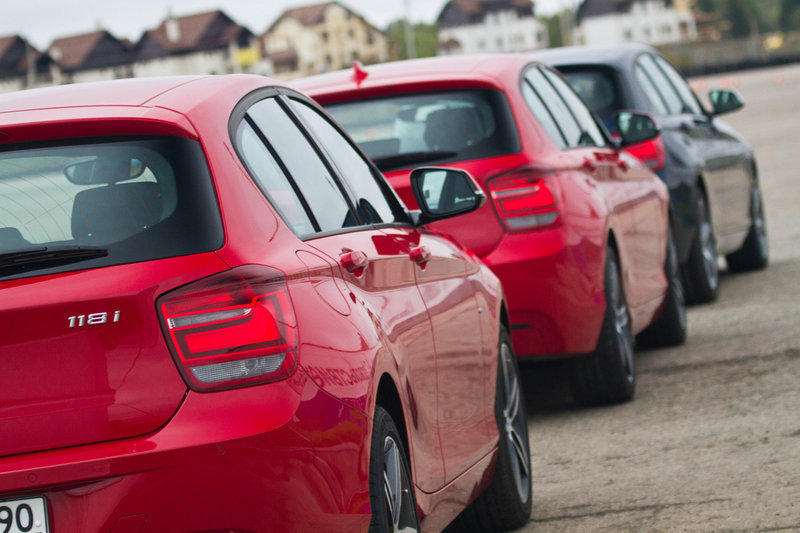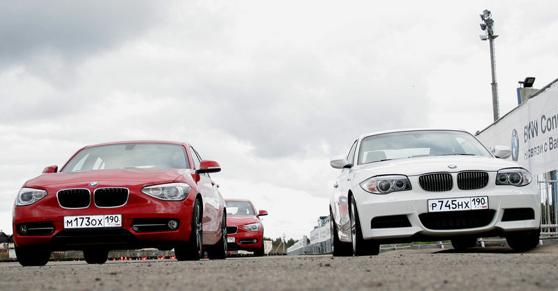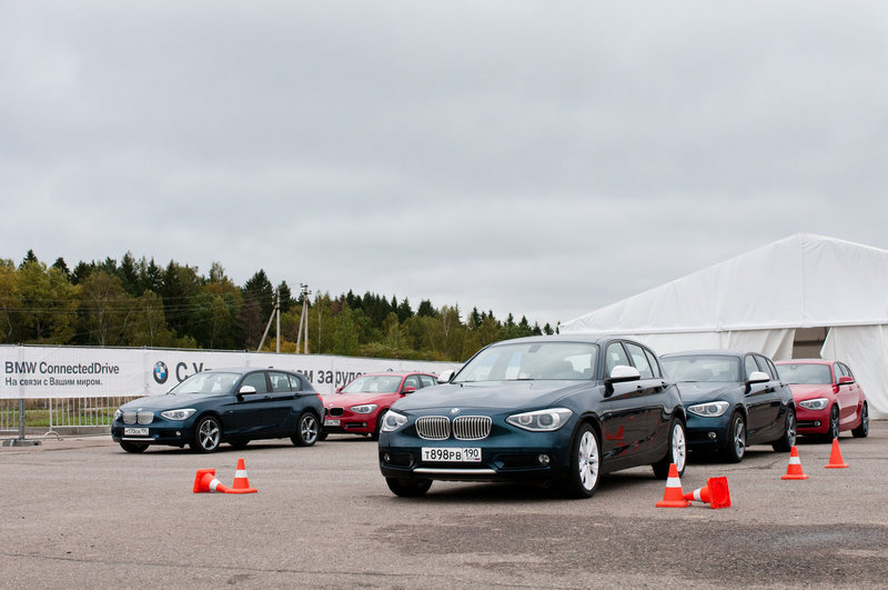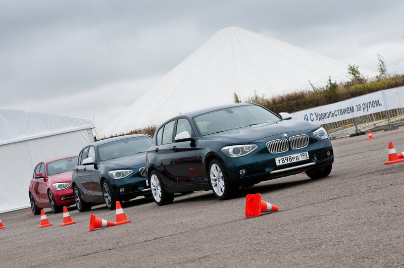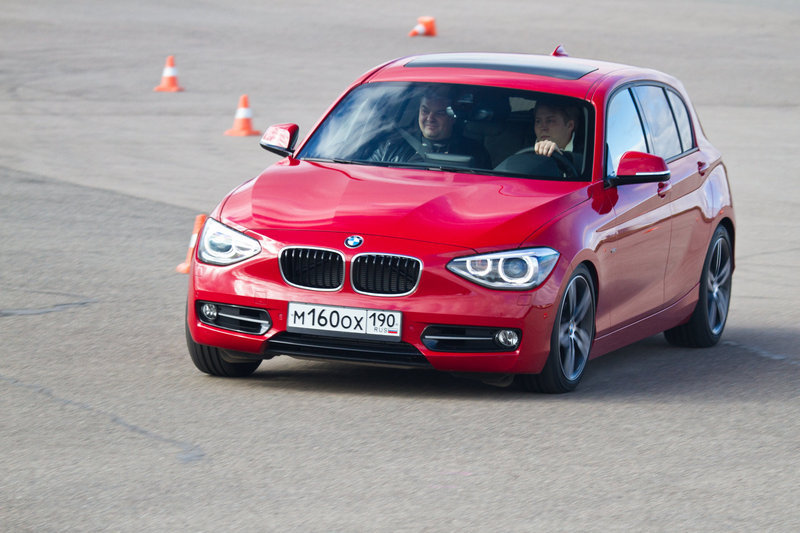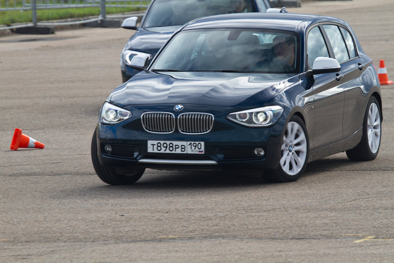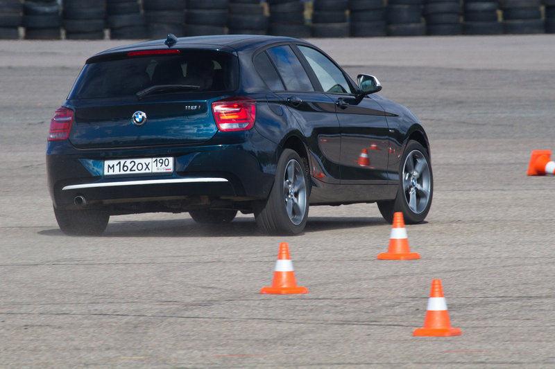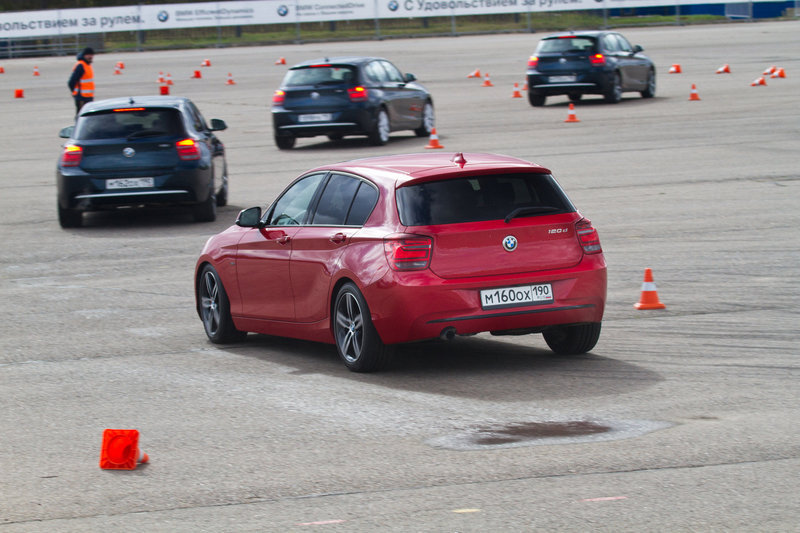 Главное – то, что перед глазами: асфальтовый полигон, с размеченной конусами, манёвренно-скоростной трассой и длинный рельефный капот агрессивно-красной BMW 120d с опциональной системой адаптивного спортивного рулевого управления. Несмотря на шильдики «SPORT» на передних крыльях, первый круг спецучастка готовимся пройти в «комфортных» настройках автомобиля.