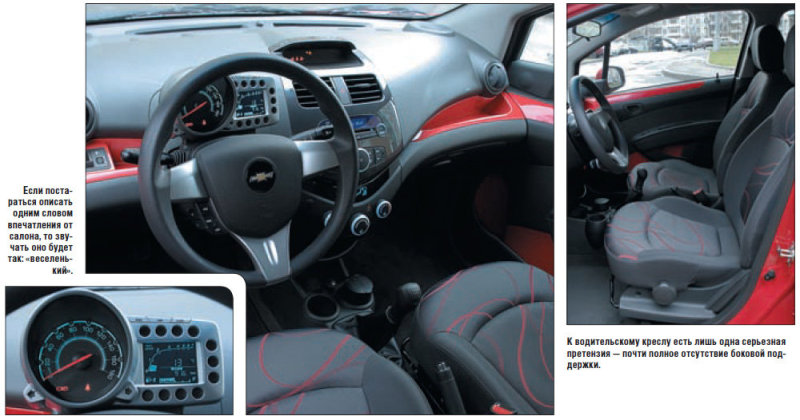 В водительском кресле неплохо устроится даже достаточно высокий человек, благо потолок тут вознесен на внушительную высоту. Похоже, что пилотировать Spark можно, даже не снимая ушанки. Впрочем, закладывать дикие виражи — не дело такого типа авто. От него в первую очередь требуется чинно доставить тела седоков от дома в спальном районе до детского садика, затем к офису, а вечером — в обратном порядке. Дополнительный плюс — обилие в передней части салона всевозможных емкостей для мелочей. Не забыт конструкторами даже выдвижной ящичек под передним пассажирским сиденьем. Несмотря на отчаянные попытки конструкторов одновременно оснастить машинку багажным отсеком и сделать пребывание на заднем сиденье комфортным, достичь полной гармонии в этой области им не удалось. При поднятых спинках заднего дивана багажник может предоставить владельцу лишь скромные 170 литров полезного объема. Стандартная попытка 180 авторских сантиметров усесться «у себя за спиной» дала понять, что на заднем ряду существовать можно, но по возможности не очень долго.