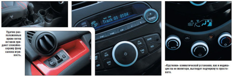 Помимо приборной доски интерьер авто может похвастаться удачным решением: «темнота» отделки передней части салона очень к месту разбавлена пластиковыми вставками в цвет кузова. Вроде бы мелочь — а как весело смотрится! С центральной консолью дизайнеры не стали выпендриваться: она расположена в привычном месте. Естественно, что ее оформление выполнено в том же духе, что и приборная, с позволения сказать, доска.