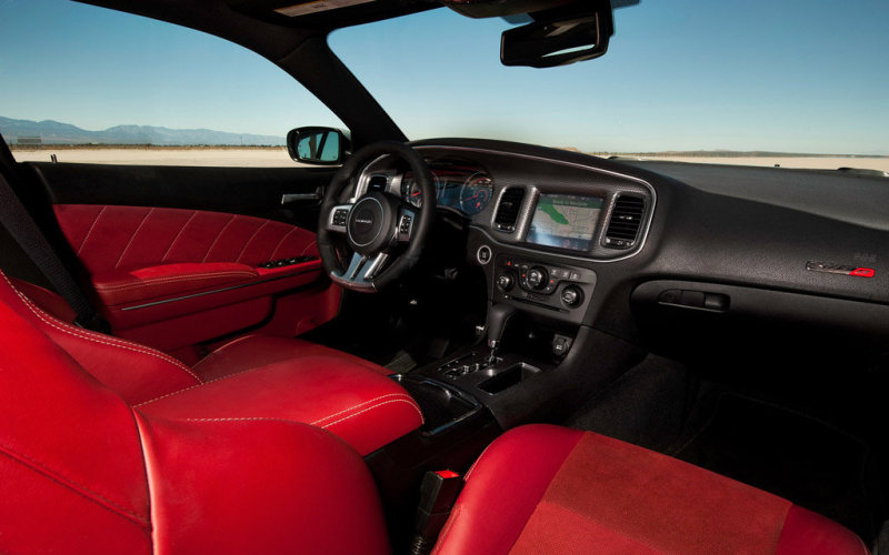 У «Чарджера» длинная колесная база, и в салоне просторно: посадка спереди и (втроем) во 2-м ряду вполне свободная. Внутренняя ширина на уровне плеч сзади – 146,5 см, немереное пространство для ног. И все же рослым пассажирам сзади не особенно удобно: потолок низковат - из-за покатой линии крыши. Интерьер спорт-седана оформлен на «премиальном» уровне. Кругом первосортные отделочные материалы: недешевые пластики, тканевая (в не самых дорогих исполнениях) обивка сидений достойного качества и привлекательной текстуры. Многофункциональная спорт-«баранка» (со срезанным нижним сегментом) настраивается по углу наклона и вылету, а передние сиденья регулируются не только продольно, но и по высоте.