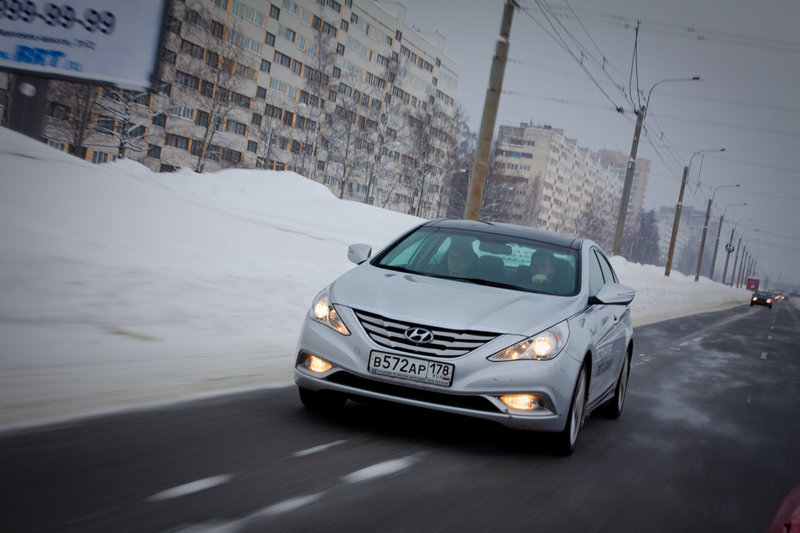 Hyundai хорош на городских скоростях. «Автомат» переключается плавно, мотор работает негромко, амортизаторы справляются с трещинами и выбоинами, и только шипованные колеса гудят, нарушая тишину в салоне. Стоит ускориться, как откуда ни возьмись начинают всплывать асфальтовые дефекты, на которых седан заметно подскакивает. Автомобиль не подает ни намека на готовность ускориться в любую секунду. Реакция на педаль газа несколько смазанная; по сравнению с Mondeo, (имеющим систему непосредственного впрыска топлива), поэтому кажется, что между нажатием на газ в «Сонате» и ускорением проходит целая вечность. На руль Sonata передается минимум информации о положении передних колес и скорости. Впрочем, в остроте руля нет недостатка; водить Sonata хоть и не так весело, как Mondeo, но все равно удобно и несложно.