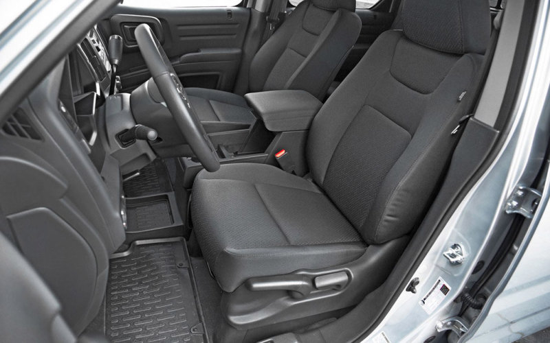 У Ridgeline 4-дверная 5-местная кабина, отделанная и укомплектованная не слабее, чем у иного седана «премиум»-класса. Оформление интерьера органично гармонирует с внешним обликом: ничего экстравагантного, просто и функционально. Без декоративных излишеств – в стиле off-road. Сиденье водителя регулируется продольно и по высоте, многофункциональная «баранка» настраивается только по углу наклона. Клавиши и переключатели на передней панели на редкость крупного формата – видимо, в расчете на манипулирование ими в рабочих перчатках. Продуманное решение. Сомнения возникают разве что насчет центральной консоли: половинчатая конфигурация оставляет впечатление этакой незавершенности.