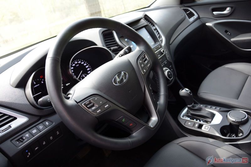 Первое впечатление от Santa Fe — размер. Причем даже не снаружи, а внутри. Садишься за руль и обращаешь внимание на широкую центральную консоль, подоконник передней панели, крупные наружные зеркала и необходимость тянуться до противоположного борта. За рулем осваиваешься быстро. Диапазона настроек рабочего места водителя в целом хватает, хотя если вы требовательны к тонкой настройке, можете столкнуться с традиционными азиатскими сложностями: короткой подушкой, недостатком диапазона регулировки по высоте. Обязательно внимательно примерьте посадку и кресло непосредственно под себя, если рассматриваете Santa Fe в качестве кандидата к покупке.