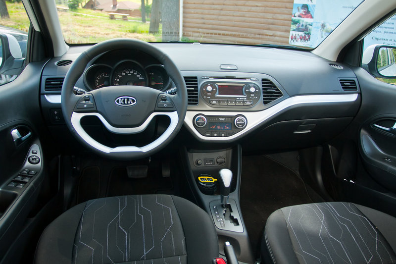 Держа в руках брелок с функцией безключевого доступа, ловишь себя на мысли, что этого девайса лишены иные престижные седаны. Интерьер же нового Пиканто и вовсе заставляет забыть о том, что находишься в автомобиле самого бюджетного класса. В максимальной комплектации Luxe белый компакт Kia щеголяет климат-контролем, крупным информационным дисплеем, аудиосистемой с USB-разъемом и поддержкой MP3 формата, звук из которой, правда, оставляет желать лучшего. Кнопки электропривода складывания зеркал, подогрева руля и запуска двигателя (!), доселе невиданные на автомобилях подобного класса, удивляют не меньше.