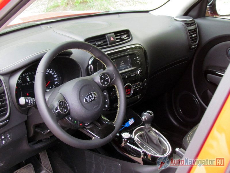 Черный лак и в салоне. Им отделаны спицы руля и значительная часть центральной консоли. Интерьер выглядит эффектно только если нет обильного числа отпечатков. Заляпанная пластмасса смотрится менее презентабельно. Хотя особенной презентабельности от Soul и не ждешь. Не тот класс. Ждешь, скорее, нестандартных решений, интересных деталей и затейливых воплощений.