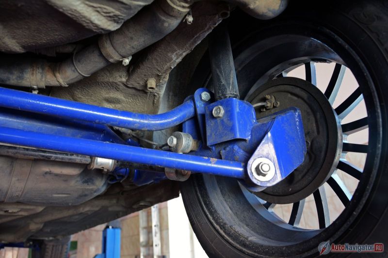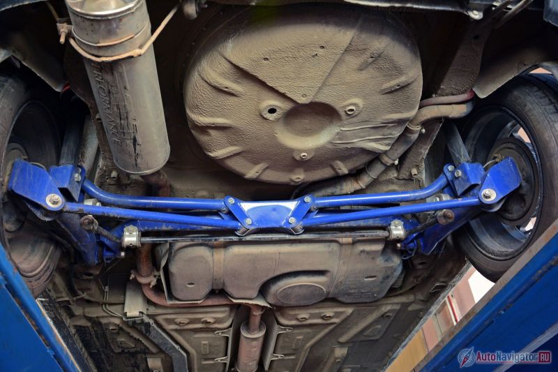 При такой высоте над землёй передний подрамник и задняя независимая подвеска ярко-синего цвета выглядят «по дворовому» броско. Распорки в багажнике и под капотом, работающие на улучшение жесткости кузова, – тоже не лишены скромности.