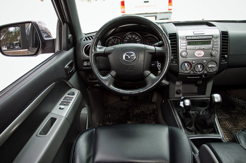 Mazda слеплена из другого теста, и ее серебристая магнитола выглядит инородным телом в небогатом салоне. Здесь-то – настоящий интерьер пикапа для неприхотливых и простых ребят из Айовы или Айдахо. Музыка, кондиционер и электростеклоподъемники, вот практически и все, что торчит из жесткого салонного пластика передней панели «БТ-шки». Руль регулируется только по высоте, а удобное (и кажется ортопедически безвредное) кресло нельзя настроить по вертикали.
