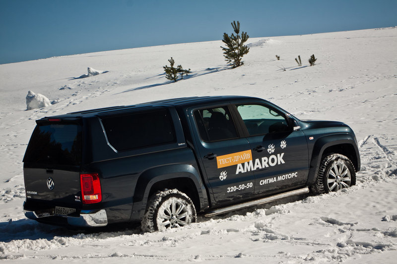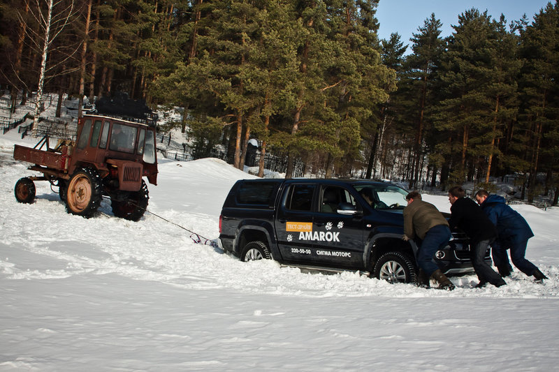 Не повезло «Амароку», причем на нашей памяти не первый раз - он ехал первым. Подтаявший снег и ледяная корка под ним сделали свое дело – против Volkswagen природа выставила небольшую горку, которую мы с успехом штурмовали много раз, на куда менее грозных автомобилях. Прямо у ее подножия Amarok начал медленно проваливаться и секунд через 15 плотно завяз, сев на оба моста.