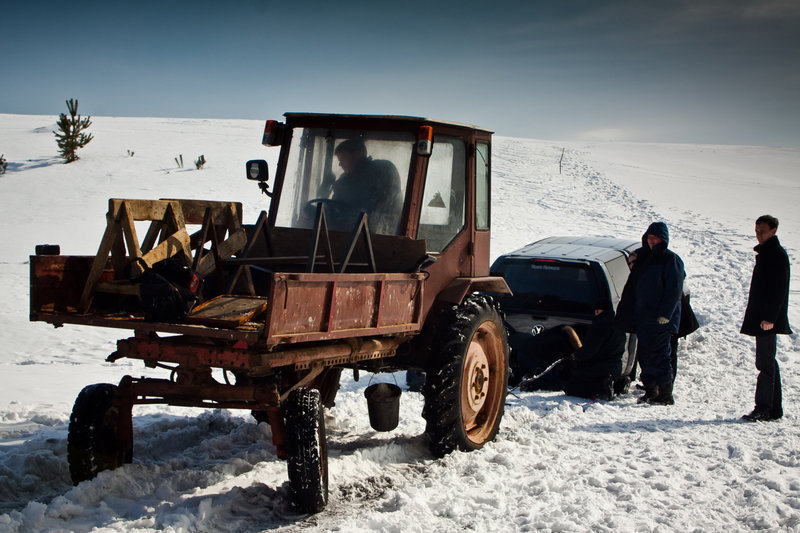 И тут… (Я понимаю, что чудеса бывают лишь в сказках, но здесь я не погрешу против истины). И тут, быстрее, чем замерзшие руки смогли бы набрать номер телефона службы эвакуации, к нам подъехал небольшой трактор. Вместе с 16-сильным двигателем и металлическим тросом… Проблема была решена за минуту. Едем дальше.