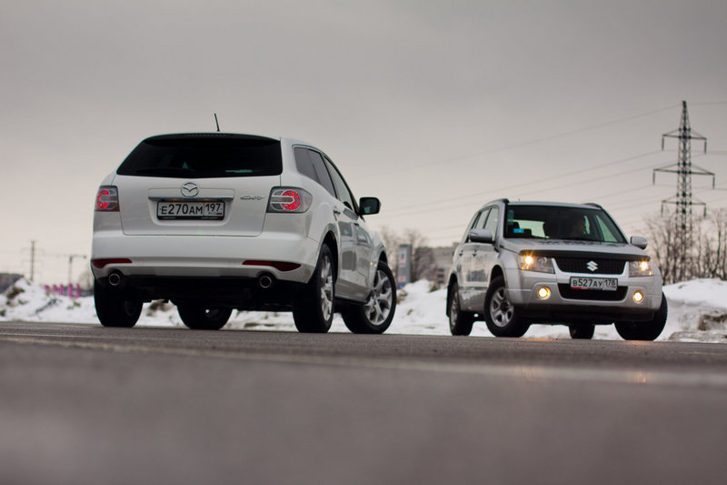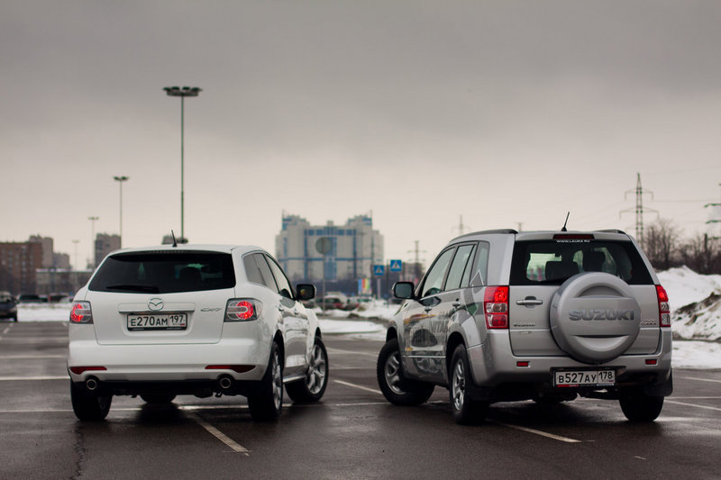 Во внешнем виде машин читается их разница в классе и базовой стоимости; ярлык «Премиум» прекрасно сидит на Mazda, но только чистый Suzuki не навевает на мысль о том, что его владелец только что вернулся с дачи. Двухсотмиллиметровый клиренс, угловатый кузов и прикрученная к распашной задней двери запаска передают недвусмысленный сигнал: хозяин Grand Vitara часто бывает за городом. Вид СX-7 – стильный каплевидный силуэт с плавными обводами говорит, что его владелец – городской житель, и клиренс вместе с полноприводной трансмиссией нужны ему для уверенной езды именно по каменным джунглям.