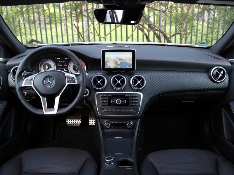 Внутри A-класс - настоящий "Мерседес". Качество материалов такое же высокое, как и в более дорогих моделях марки. Подгонка деталей восхитительная. Дизайн торпедо вызывает не меньше приятных эмоций, нежели таковое у конкурента Audi A3 последней генерации. Чувствуются ретромотивы - к примеру круглые дефлекторы отопительной системы на центральной консоли и боковинах - это своеобразный привет из 70-ых годов прошлого столетия. Отделка панели "под кожу" и "под карбон" одинаково хорошо сочетается со всеми другими элементами салона. Над тремя воздуховодами горделиво восседает крупный дисплей мультимедийной системы COMAND Online c почти 15-сантиметровой диагональю, блок климатической установки находится в самом низу.