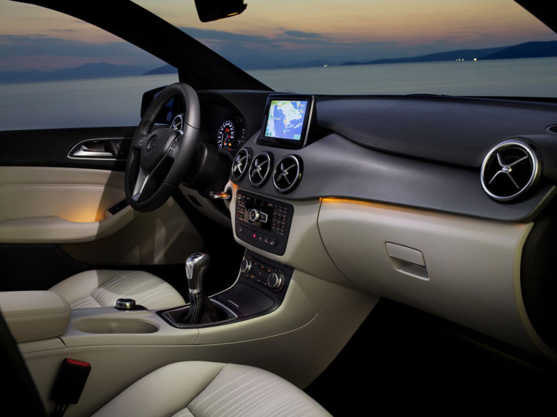 Интерьер B-класса II выглядит великолепно – во всяком случае, навскидку. Натуральный «мерс». Тогда как пристальный взгляд обнаруживает разнобой в качестве отделочных материалов: передняя панель декорирована – с претензией - по низу «под древесный шпон», хотя на деле там довольно-таки жесткий пластик. И не только там… Неровный уровень. Зато приподнятая посадка дает водителю как бы «командную» позицию за рулем B-класса. Обтянутая кожей мультифункциональная «баранка» настраивается по углу наклона и вылету, сиденье водителя регулируется не только по горизонтали, но и по вертикали. Грамотная эргономика, тогда как обзорность далеко не лучшая: массивные передние стойки ощутимо перекрывают поле зрения – да и назад видимость тоже неважная. Так что опционная телекамера заднего обзора (плюс «парктроник») здесь совсем не лишняя.