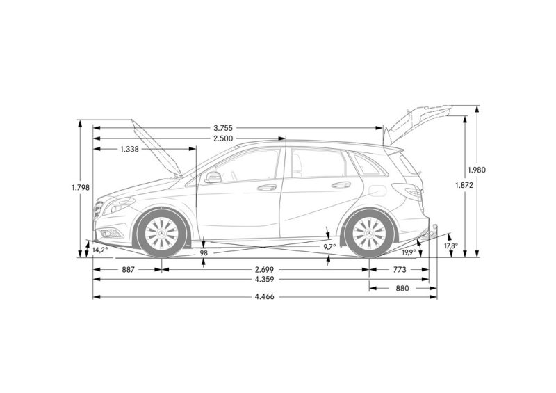 Снаряженный вес B-класса с бензиновым M270 - от 1320 кг, с турбодизелем – от 1400 кг. С 122-сильным 16-клапанником на бензине и ручной КПП компакт-«вэн» способен разогнаться с места до 100 км/ч за 10,4 сек. Объявленная максимальная скорость – 190 км/ч, а бензина он расходует в среднем (EU5) меньше 6 л на 100 км пробега. С 156-сильным двигателем время разгона до «сотни» улучшается до 8,6 сек., максимальная скорость – 220 км/ч. Тогда как средний расход бензина не увеличивается: те же 5,9 л на 100 км пути. С мощным турбодизелем и ручной КПП «универсал» Mercedes набирает «сотню» за 9,5 сек., а тяжелого топлива расходует на 100 км пробега в среднем только 4,4 л. Максимальная скорость – 210 км/ч; европейский фаворит.
