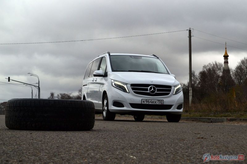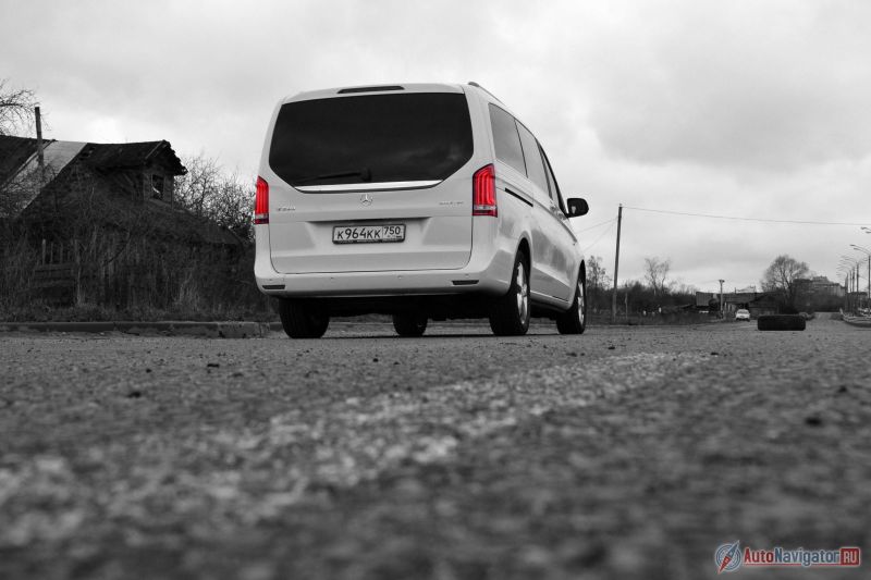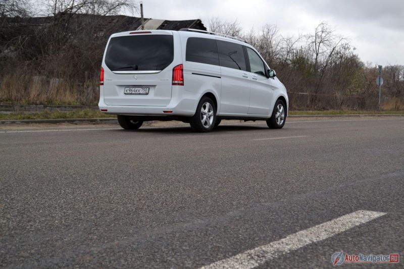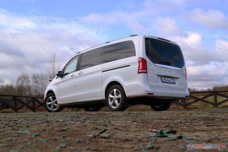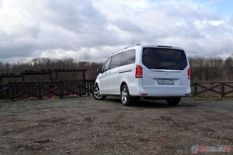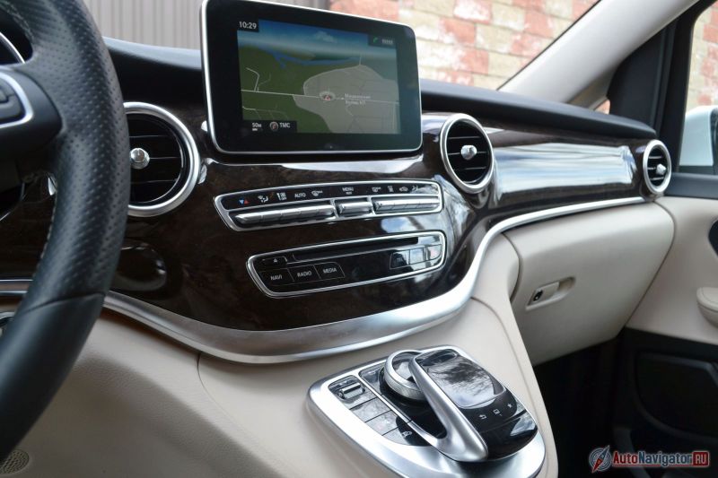 С точки зрения прибамбасов минивэн ничем не отличается от седанов. Привычная шайба под рукой с сенсорной панелью, система Command Online, большой цветной дисплей и селектор семиступенчатого «автомата» под рулем. В пассажирском салоне еще пять комфортабельных сидений, а боковые двери с электроприводом с обеих сторон. Как роскошная машина, то есть средство для доставки пассажиров с места на место в полном комфорте и тишине с элементами роскоши, V-Class однозначно лучше конкурирующей модели Volkswagen.