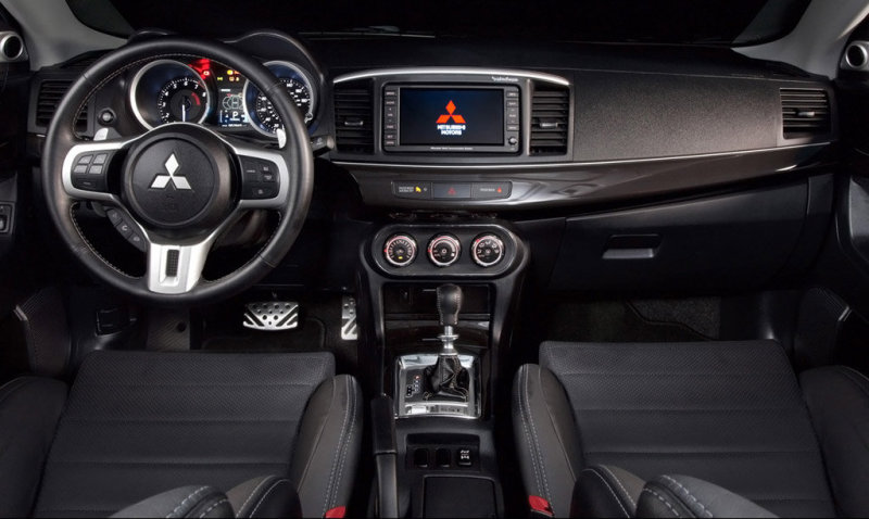 Оформление кокпита не оставляет сомнений в том, для кого и для чего предназначен Evo X. Не только для повседневных разъездов, но и для любительских ралли-маршрутов, а также для клубных кольцевых гонок. На радость «драйвера»-энтузиаста: функциональный приборный кластер, обшитая кожей 3-спицевая спорт-«баранка», рычаг КПП с кожаной обтяжкой «набалдашника», алюминиевые накладки на педалях.