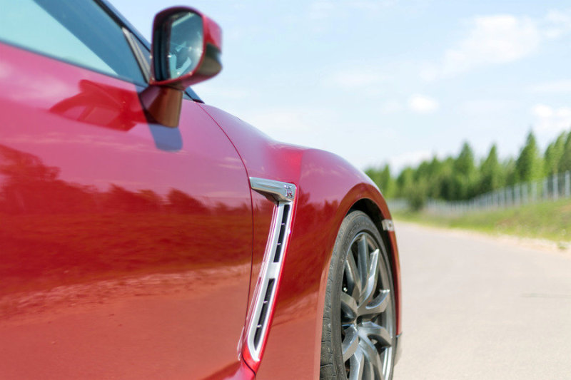 Несмотря на доминирование скрытых от глаз изменений рестайлинговый GT-R можно отличить и снаружи. Правда для этого нужно быть очень внимательным. Модернизированный экземпляр, главным образом, выделяется оптикой. Новая она и впереди, и сзади. Передние фары теперь состоят из отдельных блоков сложной формы, хотя контур самой детали остался прежним. Границы задних фонарей тоже не изменились, но их наполнение стало другим. Вместо диодных точек использованы сплошные кольца светодиодов. Красный «металлик» со стеклянной пудрой золотистого цвета – новый цвет, доступный только на модернизированных автомобилях.