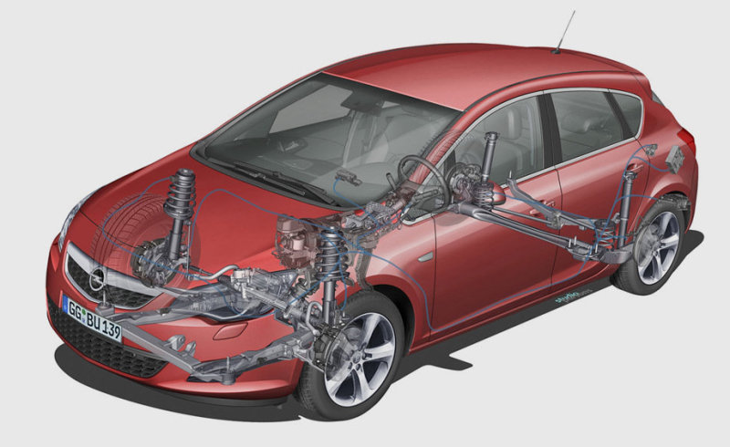 Сзади у седана Astra - механизм Уатта с двумя реактивными тягами, идущими от продольных рычагов и соединёнными коромыслом через жёсткий центральный шарнир. Эта конструкция легче и дешевле многорычажки, но по поведению близка к ней. Вдобавок такое решение позволяет снизить поперечные нагрузки на сайлентблоки. В итоге ради комфорта их можно сделать мягче. Передняя подвеска – шаблон автомобилей C-класса: алюминиевые рычаги и стойки McPherson.