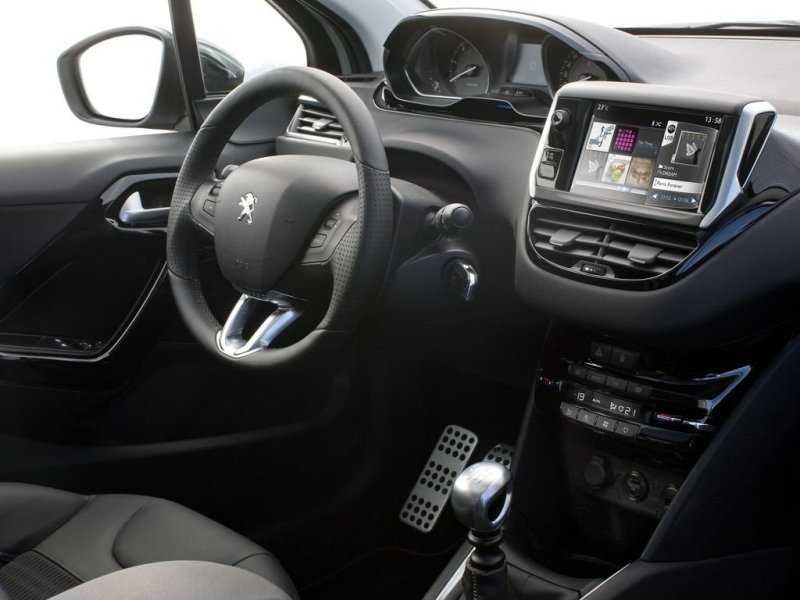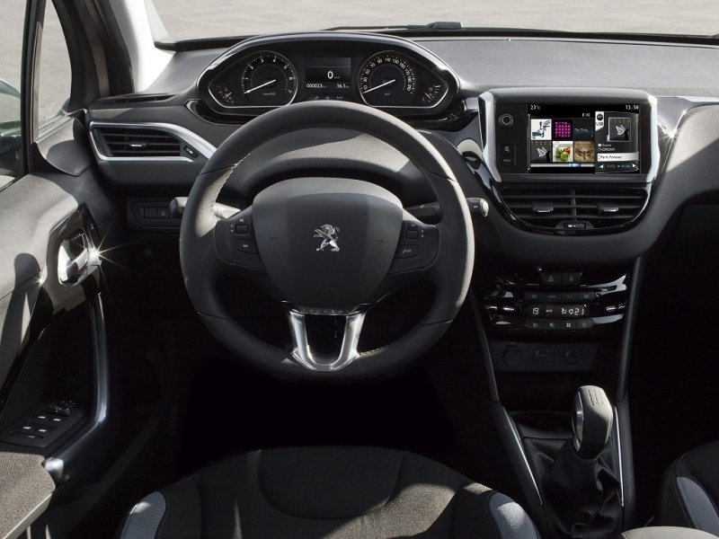 Вот тут действительно нет слов. Просто ни с чем не сравнимая дизайнерская игра. Старый салон 207-го просто меркнет после космического интерьера из другого измерения 208-го. Переношу свой взгляд на убранство уходящей с конвейера модели и на ум приходят лишь эти слова: тривиальность, унылость, заурядность. Именно так сильно впечатляет новый салон, в первую очередь конечно же торпедо. Приборная панель стоит особняком от руля и это подкупает. Она довольно простая и в тоже время очень стильная, такие приборы, как тахометр и спидометр находятся в нишах специфической формы, между которыми располагается дисплей бортового компьютера. Центральная консоль не менее специфична. Визуально она состоит как-бы из 2-х этажей. Верхний этаж выдается вперед, и в этом главный фокус, на нем расположен крупный сенсорный дисплей и два дефлектора отопительной системы. Но спешу немного огорчить потенциальных покупателей, в базовой комплектации сенсорный дисплей будет отсутствовать. На нижнем же этаже находятся кнопки управления климатом и другими системами. Завершают картину притягательности металлические накладки на педали и довольно качественные сидения с неплохой поддержкой.