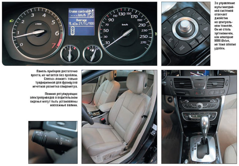 С другой стороны, расстояние между осями прямо пропорционально размерам салона. И тут Renault с Е-классом даже близко не поставить. Вот для сегмента D+ вместимость в самый раз. В передней части проблем, разумеется, нет априори — кресла достаточно удобны, диапазоны вменяемы... Хотя у кого сейчас иначе? Другое дело, что на активное перемещение в пространстве они в общем-то не рассчитаны — даже при относительно слабых боковых перегрузках подушки практически не держат. Но это (скажем, забегая вперед) вполне адекватно соотносится с характером самого автомобиля.