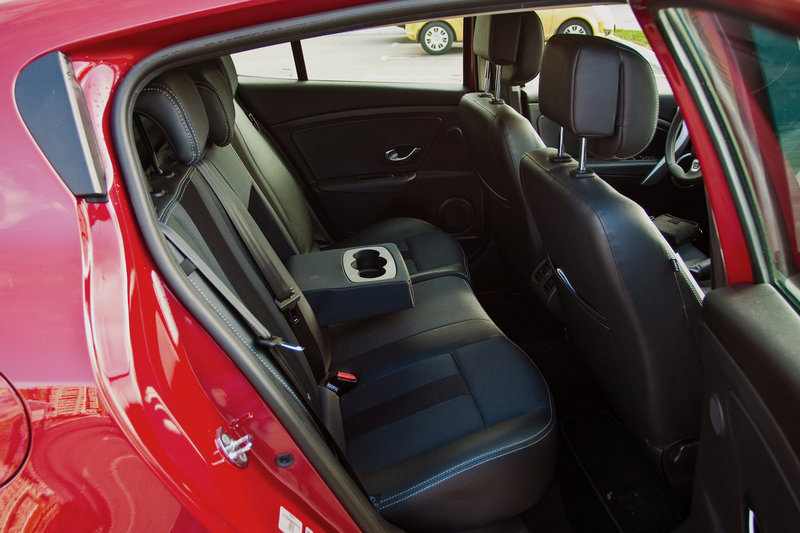 Тесновато, но гостеприимно. Передняя панель Megane приятна на ощупь. Центральная консоль покрыта качественным матовым пластиком. Интересным образом оформлен климат-контроль, имеющий клавиши температуры, которые нужно не нажимать, а толкать вверх-вниз. Удобно, особенно тем, кто с маникюром.