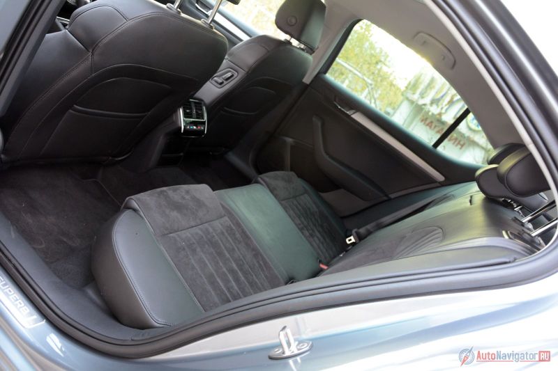 Если же говорить о богато оснащённом «Супербе» (как тестовый вариант), то в распоряжение задних седоков окажется отдельный блок климатической установки (3-х зонный климат опция за 13 400 рублей), подогревы крайних секций дивана, розетка на 220 Вольт (7400 рублей) и прочие радости. Казалось бы, весьма комфортная атмосфера…