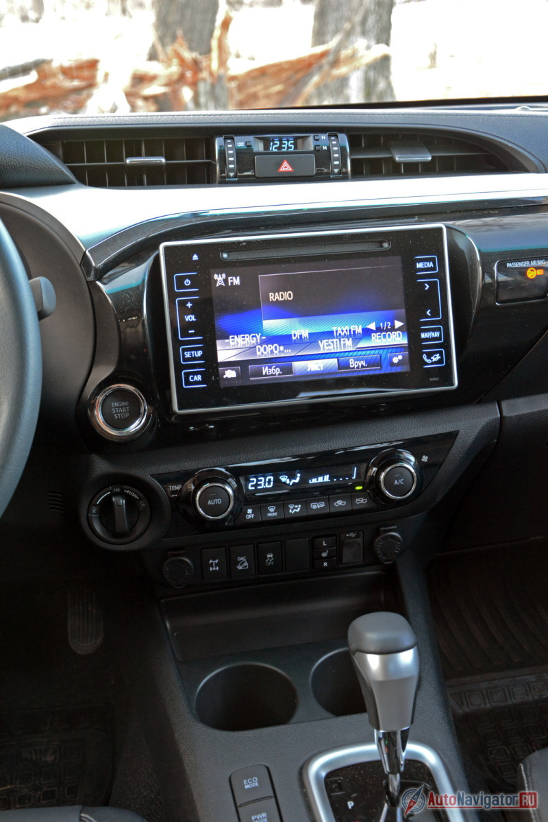 Коротать время внутри не в тягость. Салон выглядит богато и современно, хотя и исполнен преимущественно из жёсткой пластмассы. На ощупь приятны лишь кнопки климатической установки, будто позаимствованные у Lexus, да кожаный руль. В остальном – без изысков. Сенсорный мультимедийный экран, положенный средней и максимальной степеням оснащения не прибавляет чувства дороговизны. Графика навивает мысли о ранних копиях Windows. Интерфейс – тоже. Будь это не пикап, а кроссовер подобный расклад был бы недопустим, но в «Хайлаксе» на эти мелочи не обращаешь внимание. Фундаментальные ценности у пикапов иные: всё-таки самое главное в них не форма, а содержание.