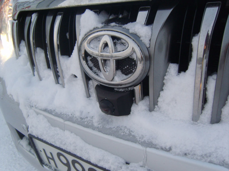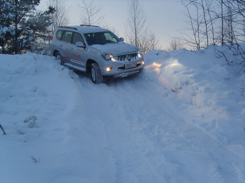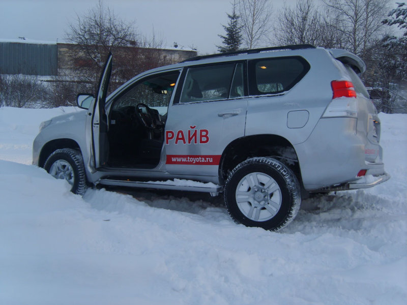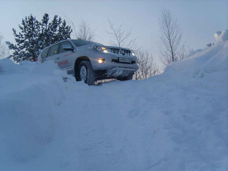 Первым делом мы принялись покорять заснеженный и весьма крутой подъём. К нашему удивлению, Prado его даже не заметил, да что там говорить, восхождение на вершину удалось со свободным межосевым дифференциалом и без активации пониженной передачи. Всю работу выполнили тяговитый двигатель, хорошая геометрия кузова и грамотно построенная противобуксовочная система. Дальше нам предстояло проехать через занесённый снегом участок. В отдельных местах глубина сугробов была такова, что легко скрывала верхний обод диска. И, вдохновлённые недавним успехом, мы отправились туда, даже не проверив наличие лопаты, за что и были тут же наказаны. Автомобиль банально сел на брюхо, чему не смог помешать даже солидный дорожный просвет, составляющий 220 мм. Оказавшись в западне, начинаем включать и блокировать всё, что только возможно. А арсенал у нового Prado весьма богатый и включает блокировки заднего межколёсного и межосевого дифференциалов, пониженную передачу, а также систему Multi-Terrain, о которой мы писали ранее. К тому же водитель имеет возможность получения информации о том, что находится прямо перед колёсами, сзади и сбоку автомобиля. Четыре камеры выводят изображение на монитор, оберегая водителя от вредных, а порой даже опасных действий. Думаем, на узких горных дорожках новой системе не будет цены.