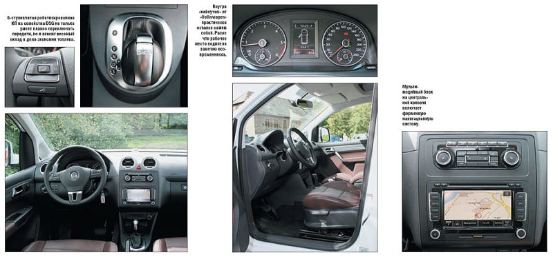 Глядя на Caddy со стороны, сразу замечаешь следы «улучшайзинга». В первую очередь это касается передней части машины. Фары в соответствии с текущим фирменным «дресс-кодом» приобрели фирменные «уголки». Капот получил чуть больше рельефности. Лицезрение профиля машины мало чего нового скажет даже знатоку комтранса: новый дизайн колесных дисков взгляд отметит не сразу — это вам не какая-нибудь оттюнингованная уличная «зажигалка». Сзади отличить новую генерацию Caddy от предыдущей можно лишь путем вдумчивого изучения задних блок-фар. Как и раньше, машина выпускается в пассажирской и грузопассажирской версиях, а также в полностью утилитарной грузовой версии. Каждая из них доступна со стандартной и удлиненной на 32 см базой. Количество мест может варьироваться от двух до семи. Главное преимущество любой пассажирской версии маленького «коммерсанта» заключено в просторном и функциональном салоне. Каждому из седоков доступны ящички и полочки для вещей, подстаканники, карманы в дверях и прочие багажные радости. Под потолком пристроены сеточки, а над лобовым стеклом — широкая полка. Ящики спрятаны под передними сиденьями и под ногами пассажиров второго ряда. Заднее сиденье можно сложить в соотношении 1/3 и 2/3 или снять, увеличив багажный отсек до 2850 или 3030 литров соответственно. В удлиненной на 47 см версии Maxi — до 3700 и 3880 литров. В качестве опции можно заказать Caddy с полноценным третьим рядом сидений — для транспортировки особо многочисленного семейства. Посадка водителя тут отчетливо «автобусная»: за рулем сидишь заметно прямее и выше, чем в легковушке. Крупные зеркала дополняют картину. Новый Caddy получил приборную доску, аудио- и климатическую системы, уже хорошо известные по другим моделям марки.