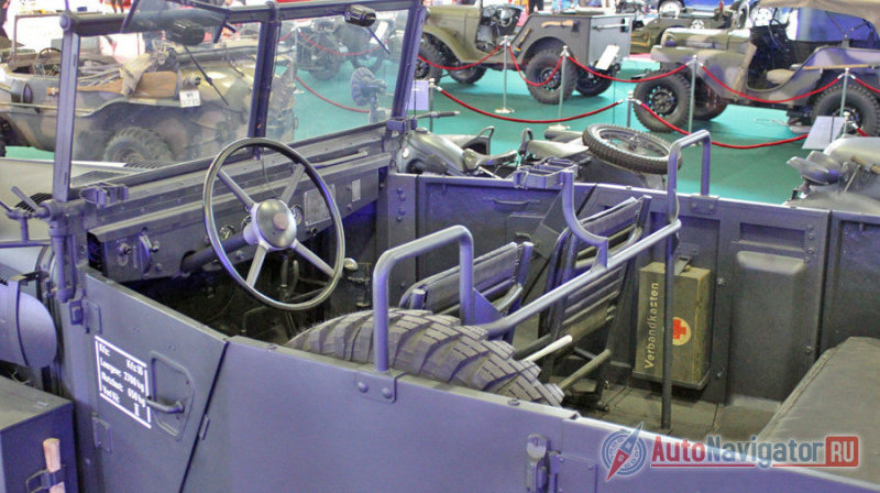 Вот машина-амфибия Volkswagen Schwimmwagen Kdf-166 1942 года: запасное колесо на капоте, весла на боковинах. Такая универсальность разом решала много задач, что в условиях боевых действий чрезвычайно важно. А вот Steyr 1500A в зимней раскраске – крайне редкий тяжелый внедорожник австрийского производства, на сегодняшний день, сохранившийся в мире менее, чем в десяти экземплярах. Рядом похожий на него Mercedes-Benz L1500A. Автомобиль такого же класса с похожей судьбой. Вот когда зародилось партнерство Styer и Mercedes-Benz! Недалеко от этих гигантов вездеход меньших размеров. Это командирский Horch-901 1938 года – самый узнаваемый автомобиль высших военных чинов гитлеровской Германии, выпускавшийся с 1937 по 1943 годы.