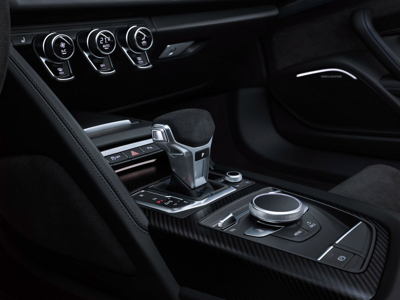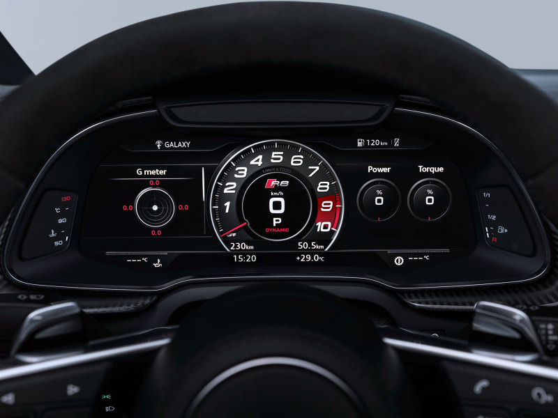 Под капотом базового исполнения обновлённых купе и родстера Audi R8 может быть атмосферный бензиновый двигатель V10 5.2 , его адаптировали к актуальным экологическим нормам и повысили мощность, теперь он выдаёт 570 "лошадок" вместо прежних 540. Более дорогая версия Perfomante имеет двигатель мощностью 620 л.с., здесь прирост составил 10 "лошадей". Оба варианта имеют 7-ступенчатую роботизированную коробку передач и полный привод.