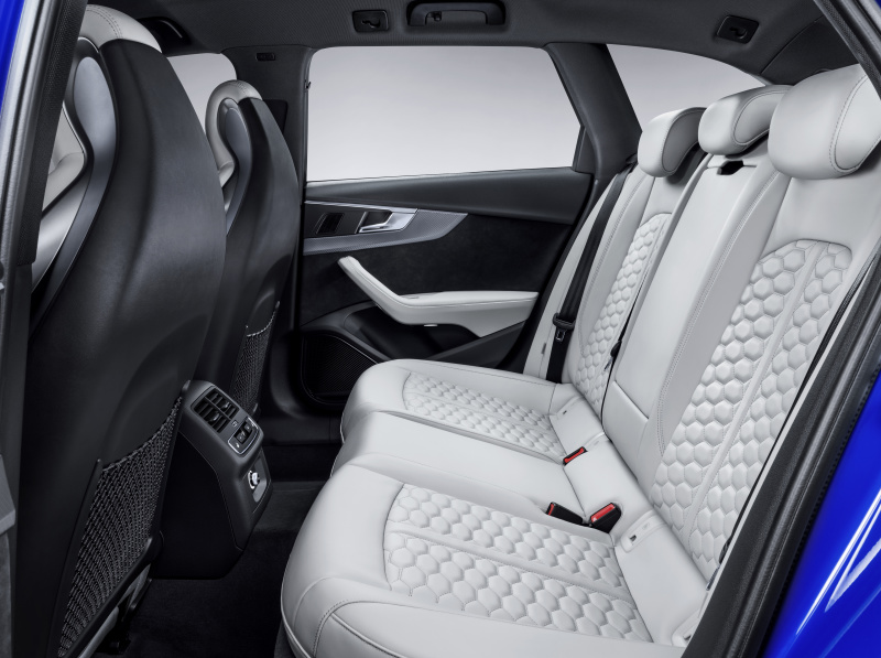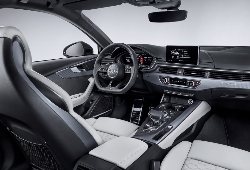 Черный цвет салона подчеркивает спортивный характер Audi RS 4 Avant. Эмблема RS нанесена на спортивные сиденья с опциональной ромбовидной прострочкой, многофункциональное рулевое колесо RS с кожаной обивкой и скошенным нижним сегментом, кожух рычага переключения передач и накладки порогов с подсветкой. На виртуальной приборной панели Audi virtual cockpit, проекционном дисплее и специальных дисплеях RS отображаются данные о перегрузках, давлении в шинах и крутящем моменте. Широчайшие возможности персонализации: черный глянцевый, карбоновые элементы с алюминиевыми или черными вставками. Программа Audi exclusive способна реализовать практически любые запросы взыскательных покупателей.