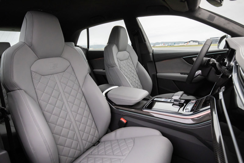 Интерьер Audi SQ8 выдержан в тёмных цветах. В стандартную комплектацию включены спортивные сиденья с тиснением S на спинках и с контрастной строчкой. В качестве опции предлагаются спортивные сиденья S plus с встроенными подголовниками и широкими валиками боковой поддержки, которые могут быть дополнительно оснащены функциями вентиляции и массажа.