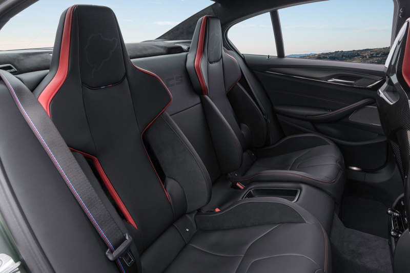 В салоне BMW M5 CS спереди поставили облегчённые спортивные сиденья, сзади здесь два раздельных кресла в спортивном стиле, вместо привычного дивана.