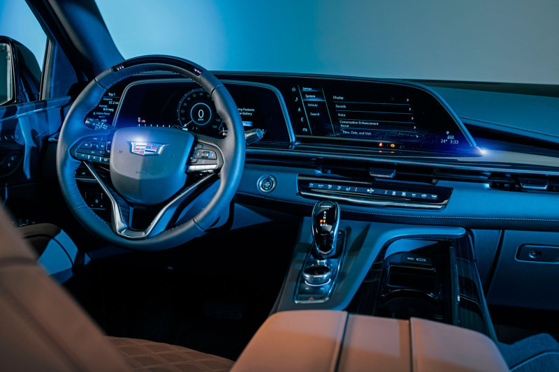 Интерьер Cadillac Escalade заметно отличается от Chevrolet Tahoe, там более роскошная отделка и полностью другая передняя панель, которая состоит из трёх дисплеев. Они сведены в единый блок.