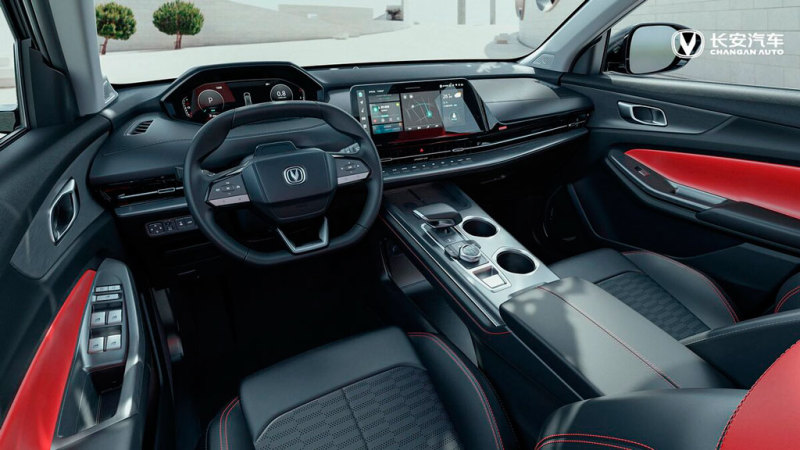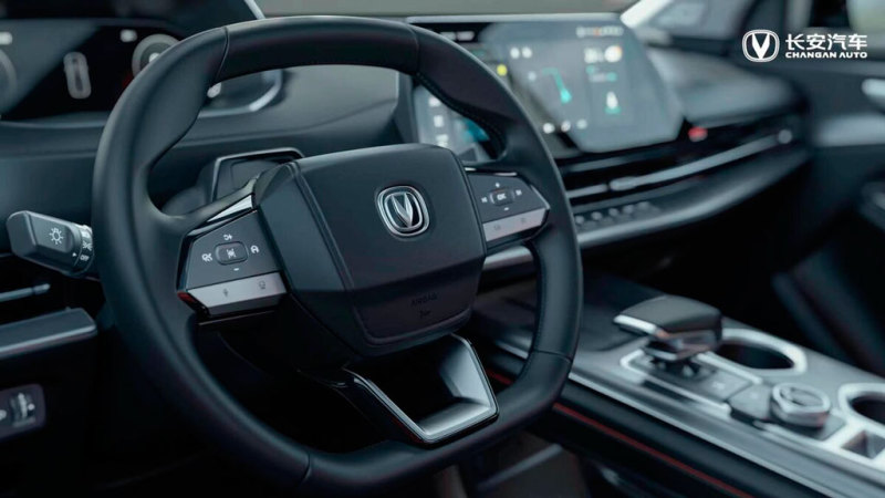 В салоне Changan CS55 Plus применяется "парящая" центральная консоль, пара крупных дисплеев и рулевое колесо необычной формы.