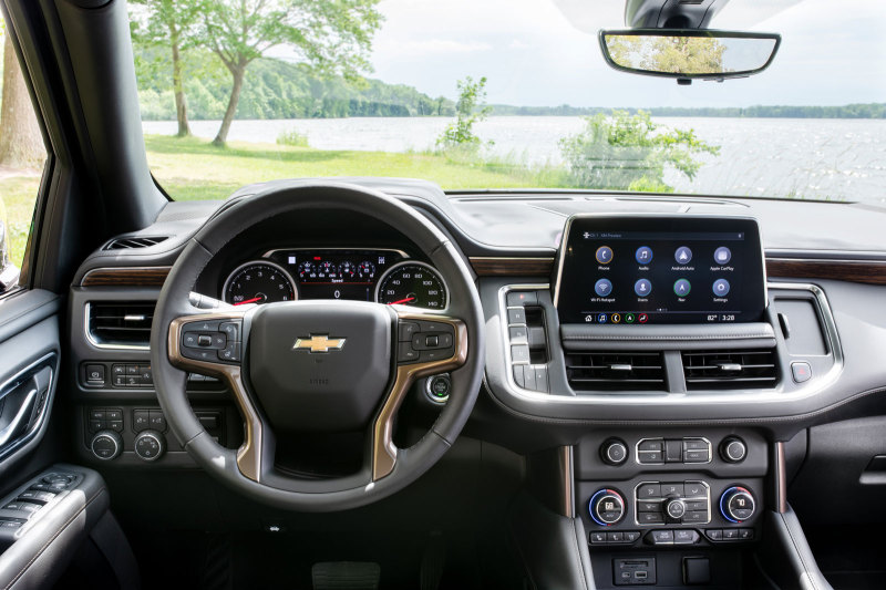 Передняя панель Chevrolet Tahoe имеет привычную планировку, перед водителем традиционная комбинация приборов, по центру панели расположен выступающий дисплей бортовой мультимедийной системы.