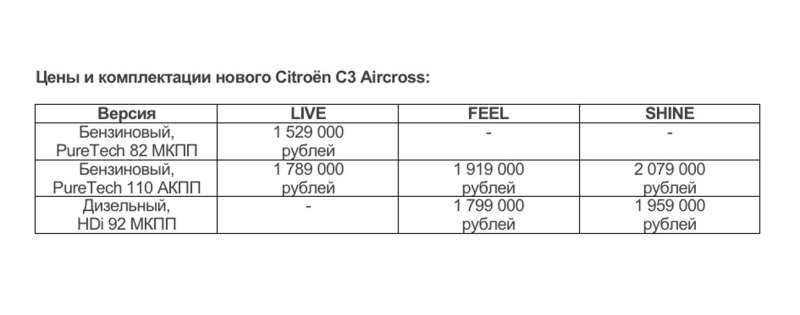 Новый Citroёn C3 Aircross доступен в 3-х уровнях комплектаций (LIVE, FEEL и SHINE) и будет предлагаться в следующих сочетаниях двигателя и коробки передач: