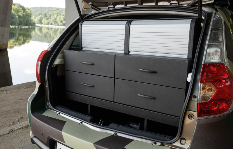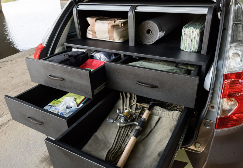 В багажном отделении предусмотрены отсеки для хранения снастей и аксессуаров для рыбалки. В нижней части багажника встроен выдвижной стол, скрывающийся в специальном ящике, а верхняя часть разделена на удобные отсеки для размещения личных вещей, доступ к которым открыт как из салона автомобиля, так и со стороны задней двери.