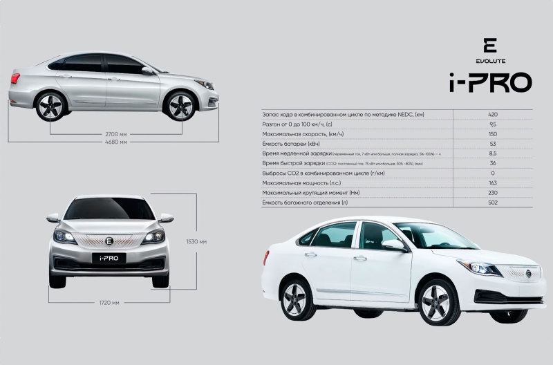 Седан Evolute i-Pro имеет электромотор мощностью 163 л.с. и 230 Нм крутящего момента, который позволяет разгоняться до 100 км/ч за 9,5 секунды. Максимальная скорость равна отметке 150 км/ч, запас хода - 420 км. На модели применяется 53-киловаттная батарея.
