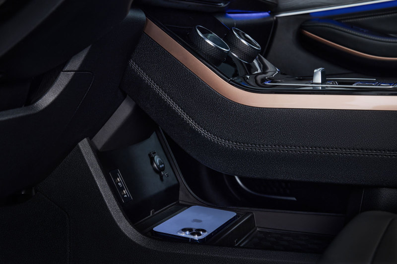 Управление климатом в салоне, подогревом сидений, обдувом лобового стекла и зеркал осуществляется на сенсорном экране, встроенным под центральной консолью. Ниже расположена беспроводная зарядка для смартфона или наушников.