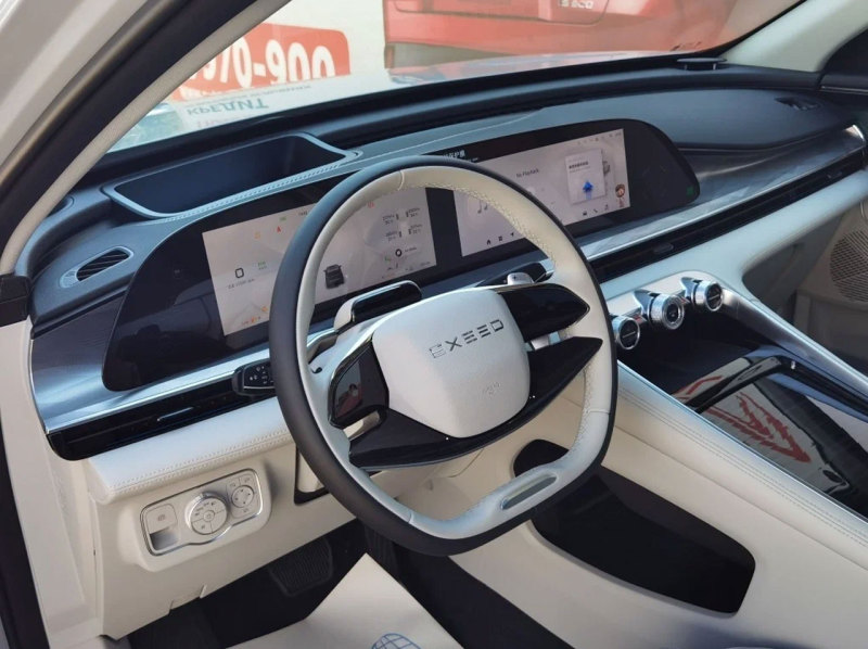 В салоне Exeed RX на передней панели расположены два экрана, между передними креслами расположилась массивная консоль с большим боксом. Режимы коробки передач переключаются подрулевым переключателем.