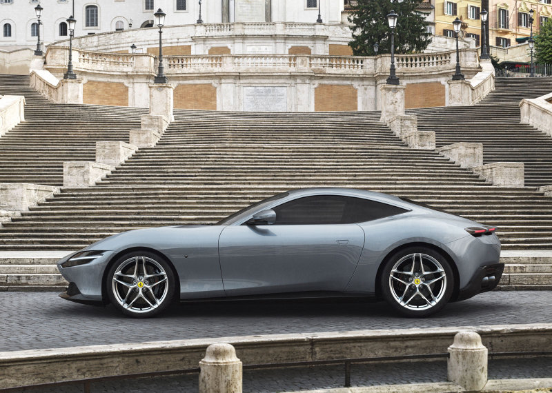 Купе Ferrari Roma длинная передняя часть кузова, которая скрывает расположенный здесь двигатель, при этом его "задвинули" в пределы колёсной базы. В целом дизайн кузова новинки оригинален и не похож на другие модели итальянской марки.