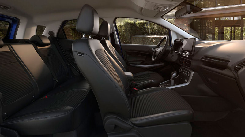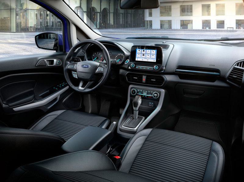 В салоне Ford EcoSport 2018 появился "парящий" экран мультимедийной системы, центральная консоль стала более эргономичной благодаря уменьшению количества кнопок и их репозиционированию. Новые сиденья стали комфортнее и легче, задних предусмотрен новый механизм складывания для увеличения места для багажа.