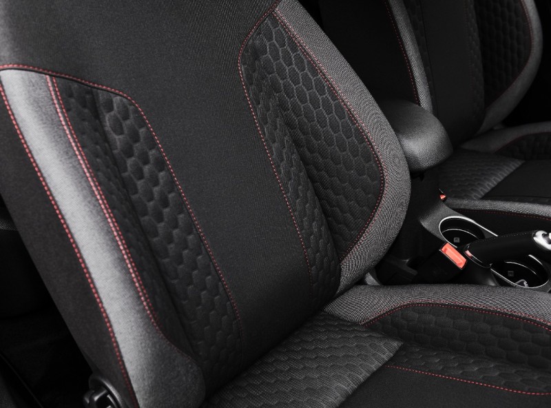 —Спортивные сиденья с красной декоративной прострочкой и рулевое колесо, обтянутое перфорированной кожей в стиле ST, с серой прострочкой;
