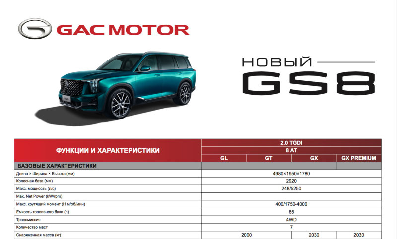 На российский рынок новый GAC GS8 будут поставлять только с полным приводом и двухлитровым бензиновым турбомотором мощностью 248 л.с., с которым сочетается восьмиступенчатый автомат от японской компании Aisin.