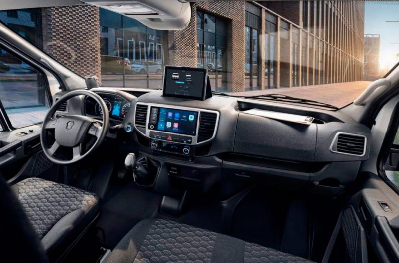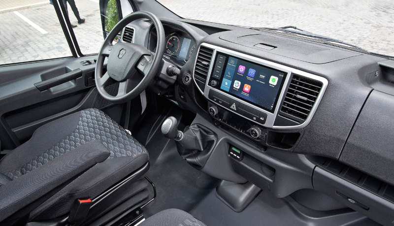 В базовом оснащении числится только подрессорное сиденье водителя, нет даже подушек безопасности. В качестве дополнительного оборудования доступны: электромеханический ручной тормоз, кнопка Start Stop, подогревы лобового стекла, зеркал и кресел, две розетки на 12V, четыре USB-разъёма, мультимедийная система с сенсорным 9-дюймовым экраном.