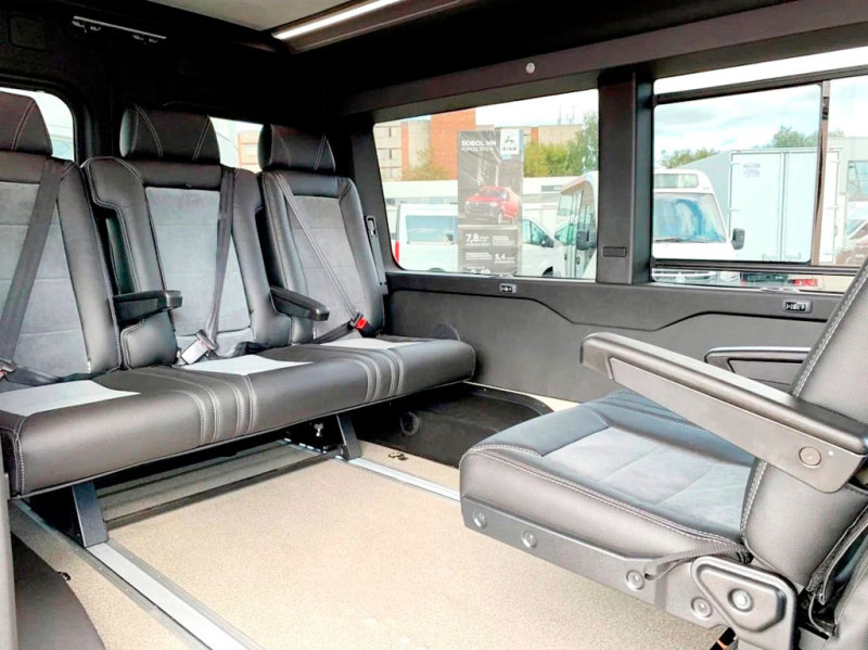 Микроавтобус оснащён улучшенной термо-, шумо- и виброизоляцией кузова, а также автоматической подножкой со светодиодной подсветкой.