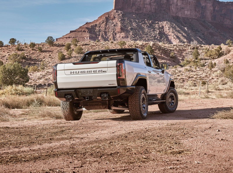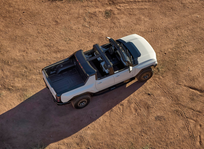 Угловатый дизайн GMC Hummer EV 2022 напоминает о прошлых моделях, кабина имеет четыре две, а заднее стекло сделано опускающимся. Предусмотрен даже электропривод тента, закрывающего открытый кузов.