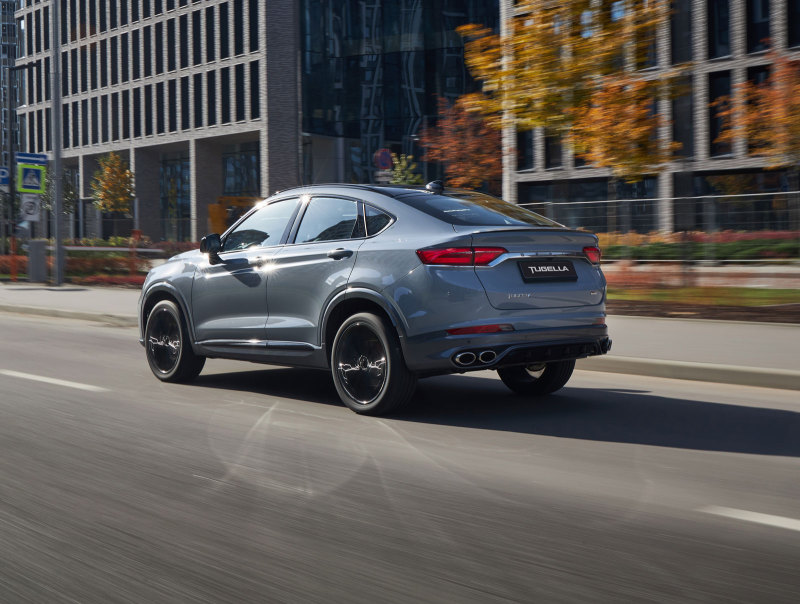 Комплектация Flagship Sport стала топовой для обновлённого купе-кроссовера Geely Tugella. В этой комплектации автомобиль получил двухцветный окрас кузова, включая чёрные молдинги на окнах, крышу, рейлинги, корпуса наружных зеркал и накладки на дверях, а также 20-дюймовые легкосплавные колёсные диски, также чёрного цвета. Имеется чёрный спойлер на пятой двери.